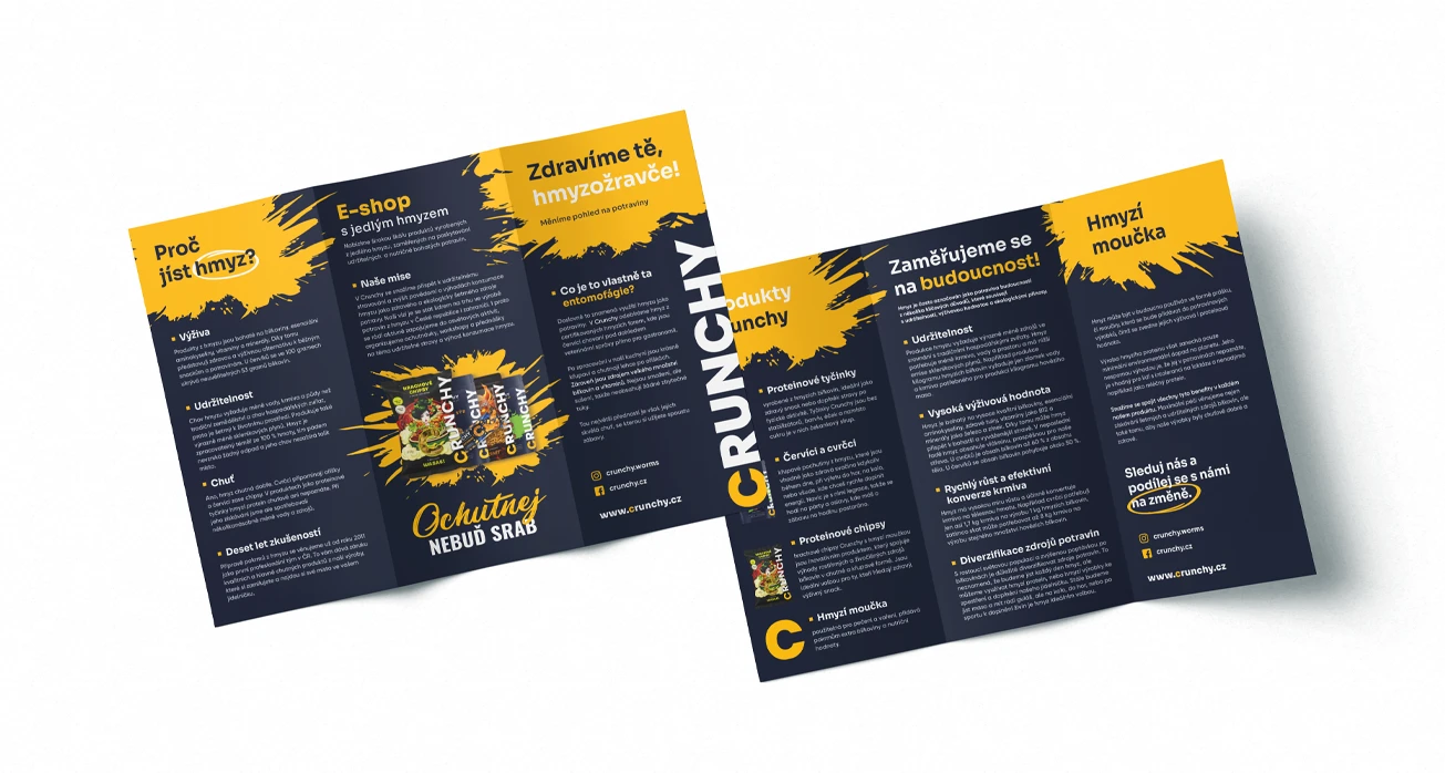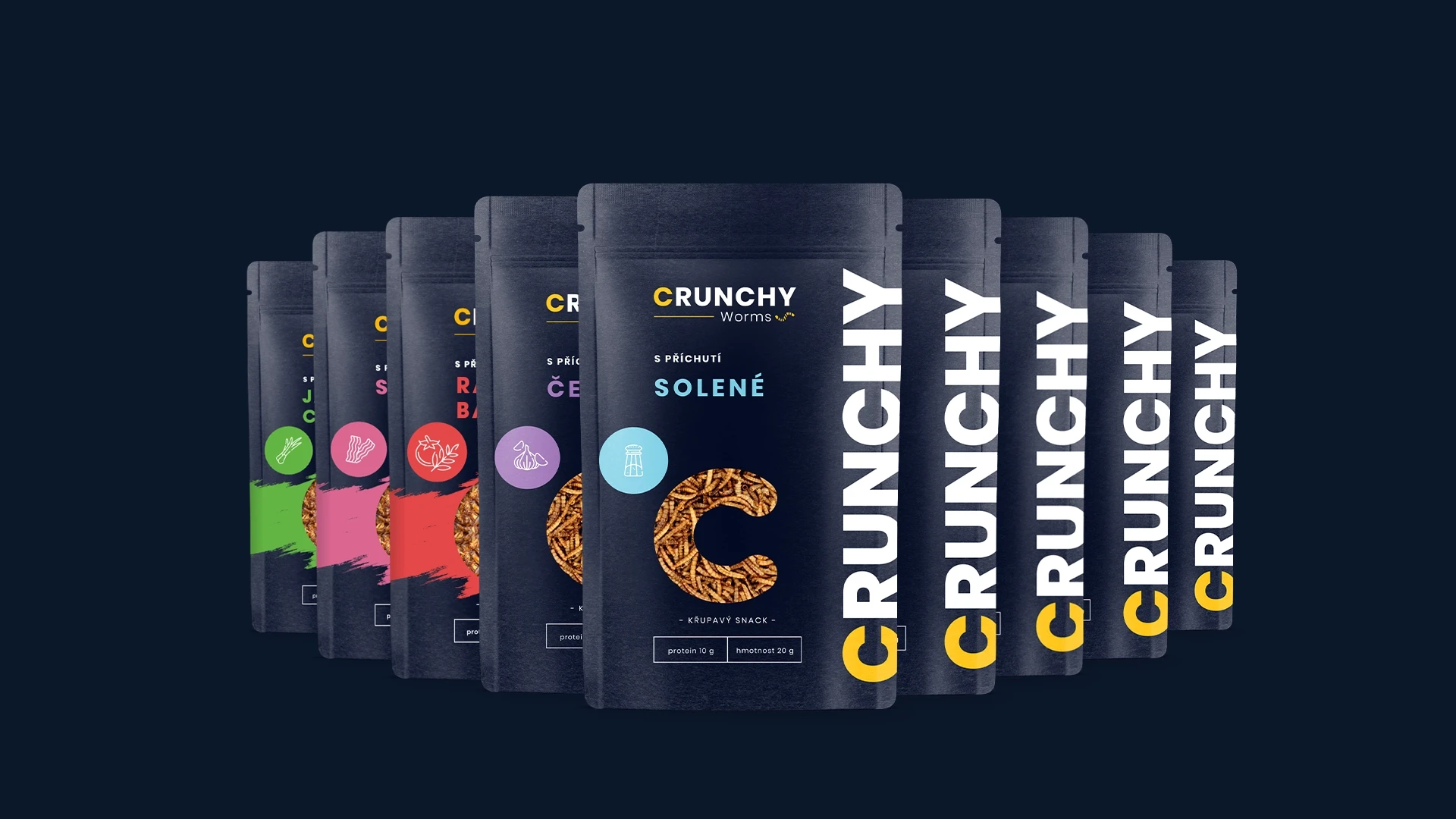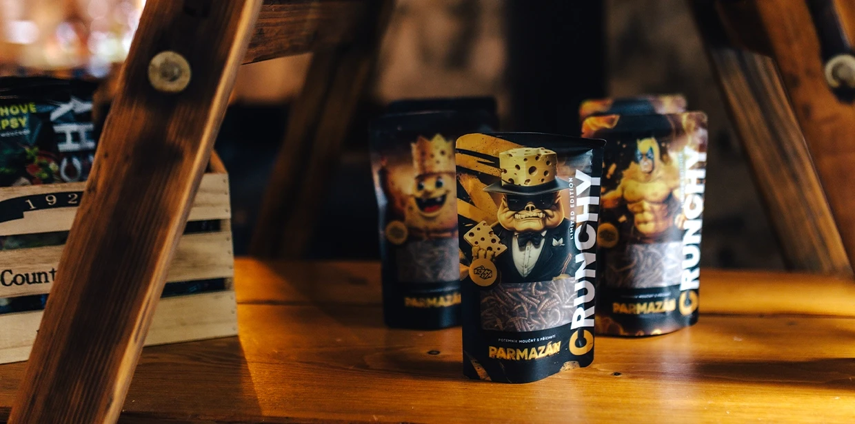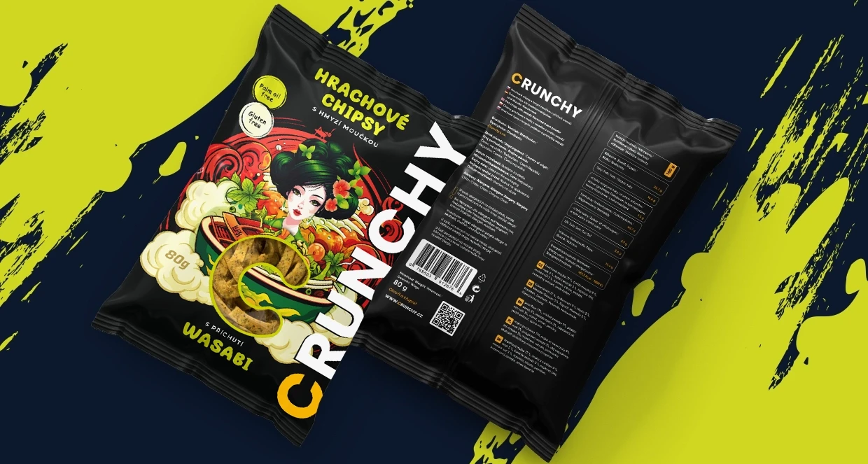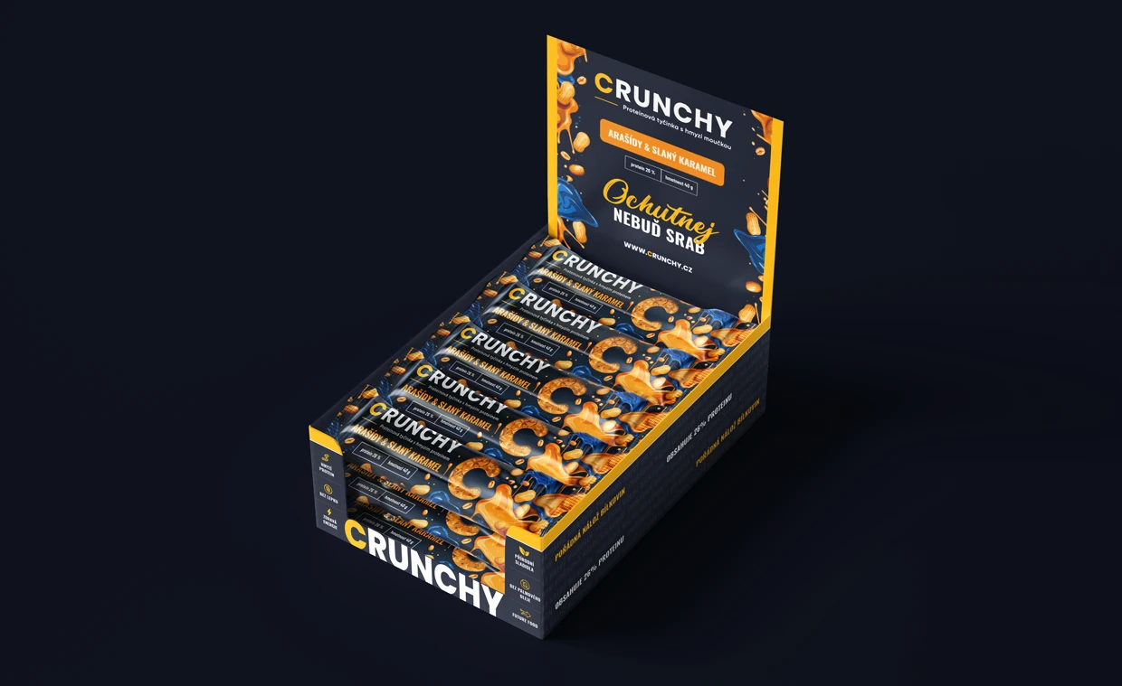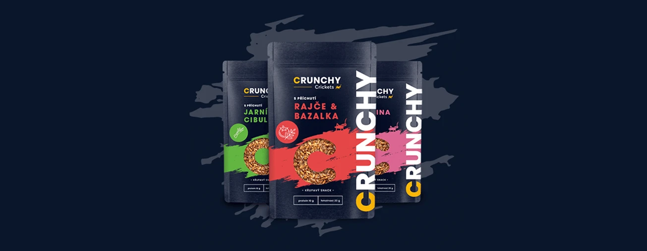 Tvorba designu obalů produktů, online bannerů i tiskovin pro Crunchy. Jedlé pražené červíky různých příchutí jsou ready to eat - stačí otevřít, křupnout a vychutnat.