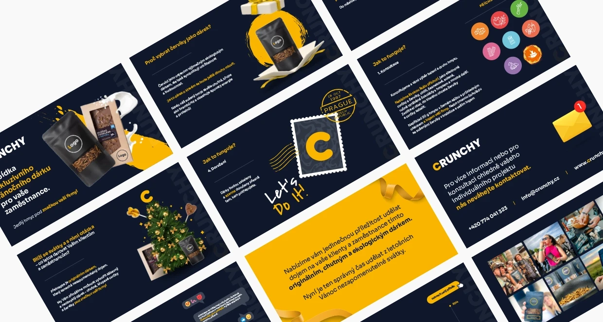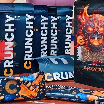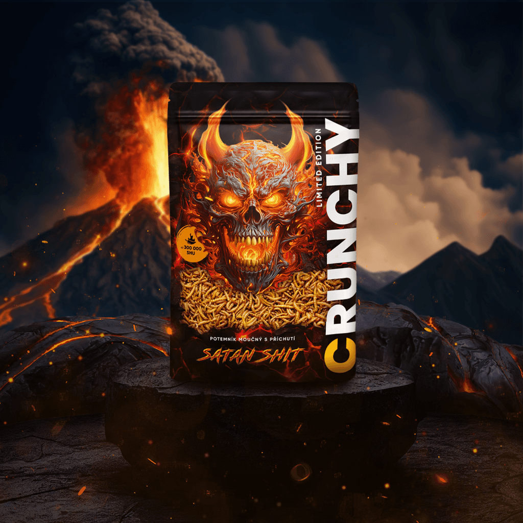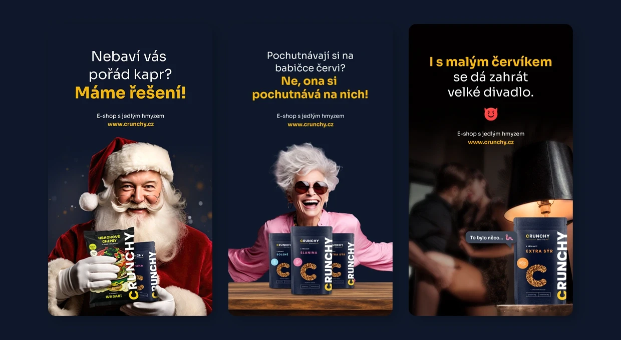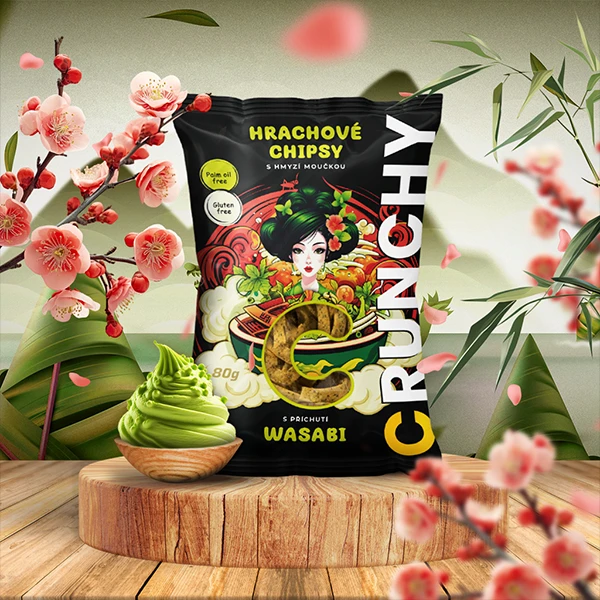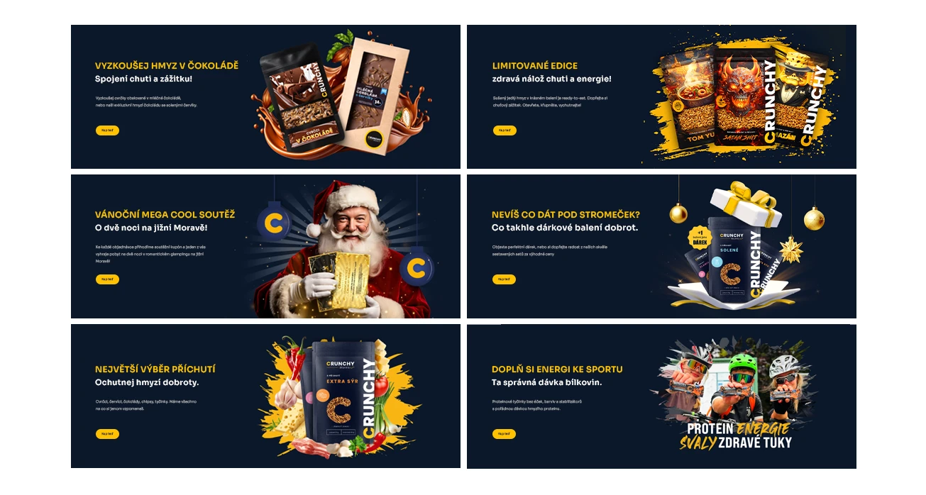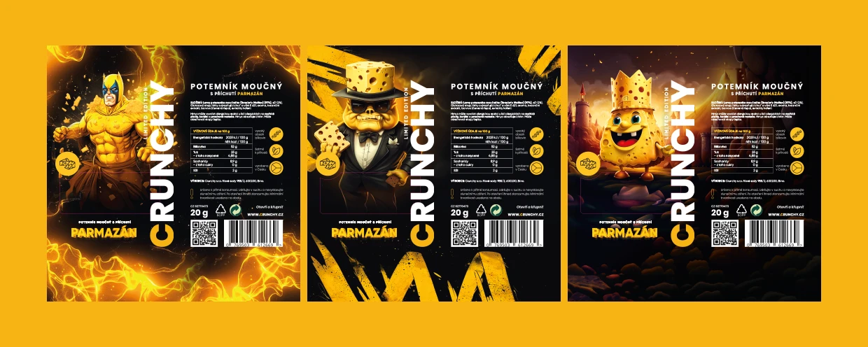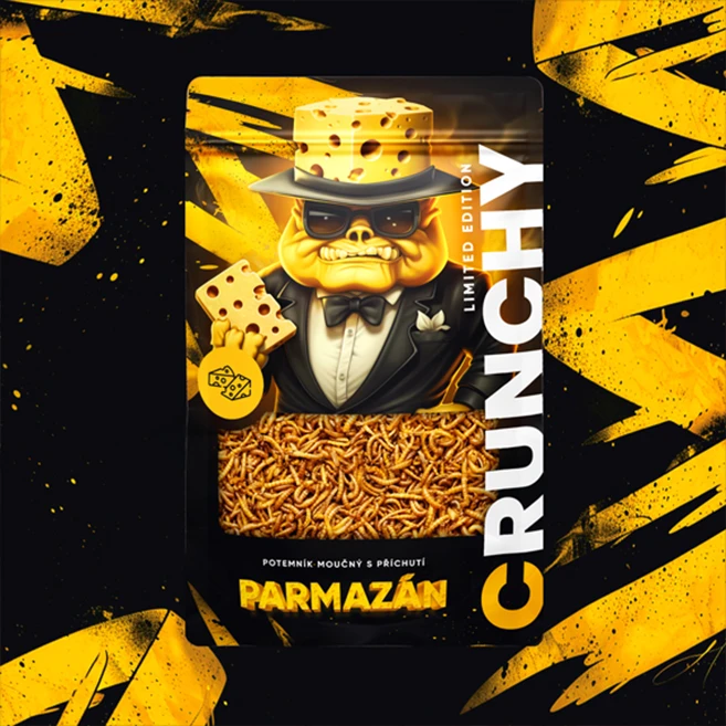 Tvorba designu obalů produktů, online bannerů i tiskovin pro Crunchy. Jedlé pražené červíky různých příchutí jsou ready to eat - stačí otevřít, křupnout a vychutnat.