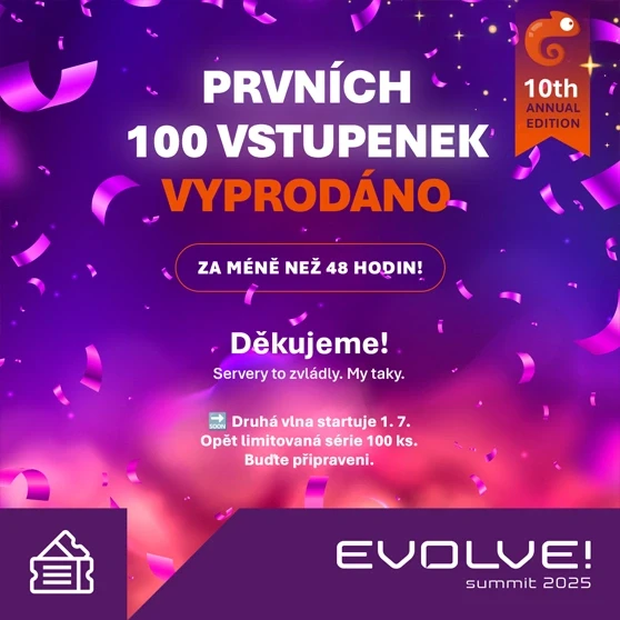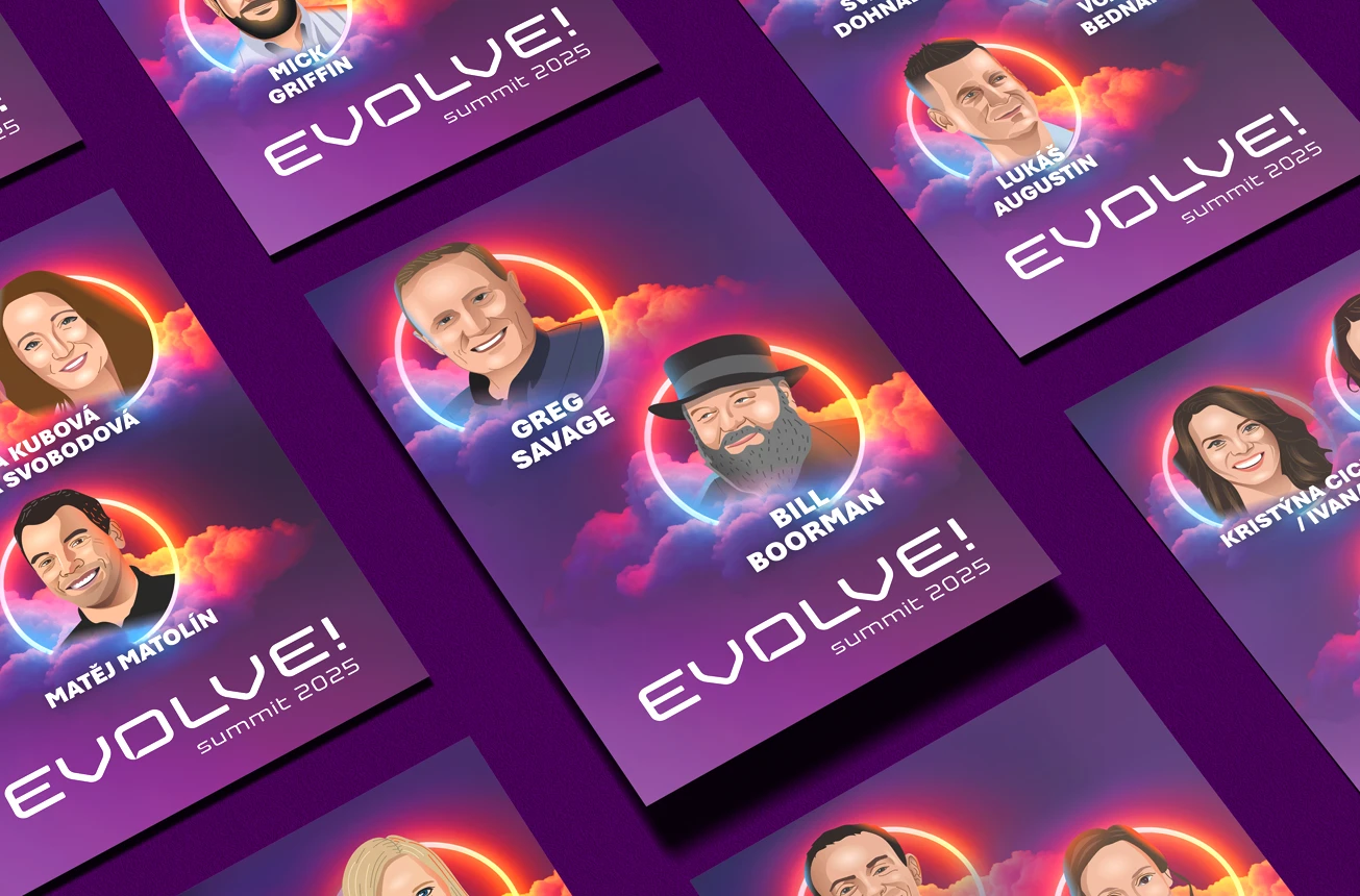 V roce 2024 jsem EVOLVE! Summit rebrandoval, vytvořil nový vizuální styl a od té doby už druhým rokem navrhuji veškerou grafiku pro event — od loga, přes vizuály programu a komunikaci na sociálních sítích až po materiály pro branding na místě konání.